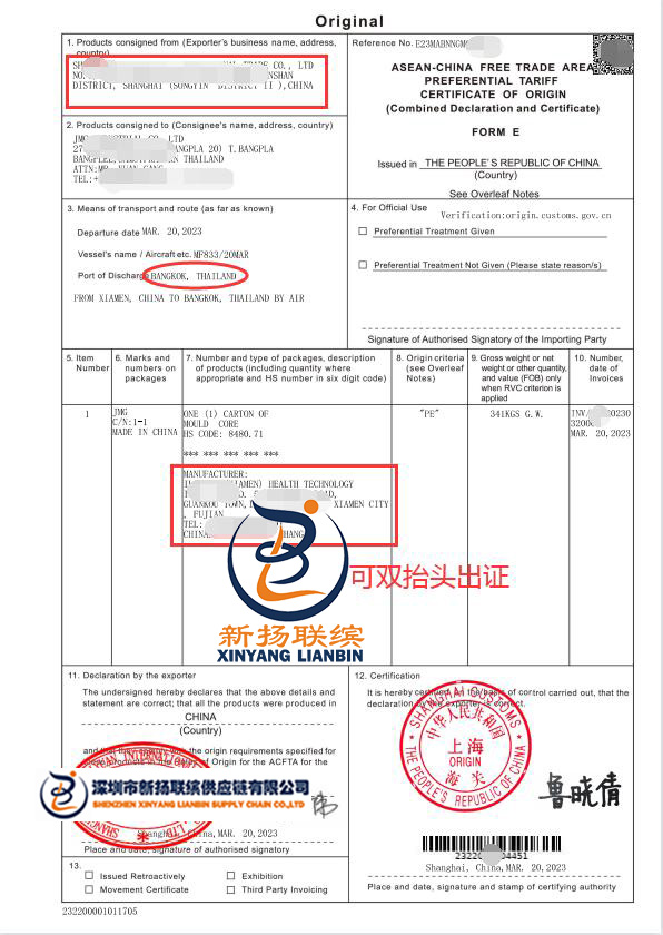 提单、商业发票、装箱单的单据shipper抬头建议保持一致,如是第三方离岸公司抬头,要显示在第七栏品名下,打勾十三栏的第四个选项,表明为第三方发票。达到资质条件所有的工厂、企业都可以申请协理原产地证也可以显示在FORM E第七栏品名下。